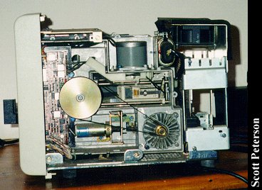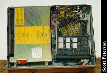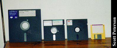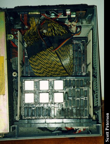 Owner: Scott Peterson Scott's comments: This is an IBM Displaywriter, circa mid-1983, although the boot disk is dated 1982. It is a dedicated word processor built around the Intel 8086 chip, but using boot disks to load the programs. Most dedicated word processors I've seen have had the software loaded in ROM. So far I haven't been able to dig up very much history on it, but even by the standards of the early 80's it was an obsolete computer. The monitor seems a standard IBM monochrome with a different mount, and is about the only thing that it shares with other computers of the era. The keyboard (which is 2½ inches thick!) has some things in common with the keyboard of the Selectric typewriter, even having a shift lock that actually locks down. The real interest of the machine, however, is the floppy drives, the huge cabinet to the right. These are 8-inch floppy drives, which this machine was the most well known for using. I believe they are 250K each, and according to one source these drives were developed as early as 1971. I'm completely mystified why IBM went through the trouble of making a machine as complicated as this just for word processing, and especially giving it these 8-inch floppy drives. The earliest models may not have had much option, but the 360K 5¼" floppy was already well developed when this one was built in 1983, and would have made it compatible to some degree with other IBM's. A few people have said that one reason IBM developed the XT and AT around the 8086 chip, with its given limitations, was because they already had the license to use it for this machine. I got this particular one for $15 from a fellow that had fallen on hard times and had been lugging it around with most of the family belongings in the back of a station wagon, and the pictures don't show how filthy it is. (It will get a thorough cleaning; I just thought it would be interesting to show how a computer can still function even covered in dust.) I only have the master boot disk (there were about five disks altogether.) and when I locate the others I'll see what the Displaywriter can still do. I'm tempted to find someway to make an 8-inch DOS boot disk and see if DOS would even be recognized, but I doubt it would work.