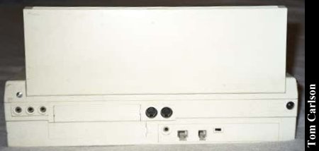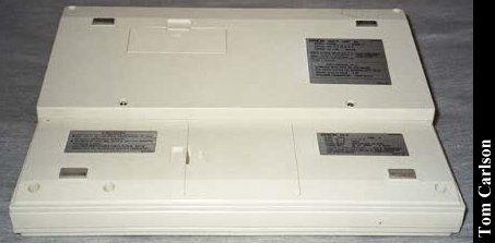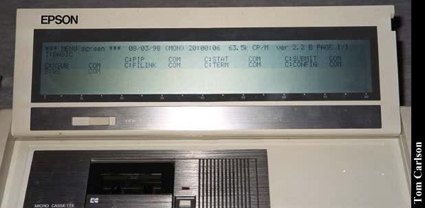 Donor: Jim Doles Why are CP/M machines just so cool? This is the Epson PX-8. It has a great little 80 column by 8 line screen, a great keyboard, a built-in modem, and WordStar in ROM. But so do alot of other older laptops. What makes this guy special is the built-in micro-cassette drive. Not only can you save programs with it, you can play back audio tapes through the laptop. Or combine programs and audio data in a custom application, a talking alarm, for example. It also has a nice protection system. The screen folds down to cover the micro-cassette drive, and a separate cover slides over the keyboard. A metal carrying handle slides out of the front. An add-on module, the Multi Unit 64, screws onto the bottom, providing additional memory, PROM sockets, and a better tilt to the keyboard. Surprisingly, the internal, rechargeable battery still holds a charge. Not for a real long time, but for more than just a few minutes.