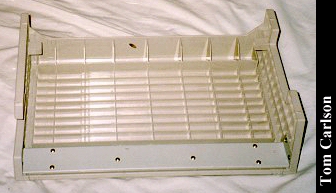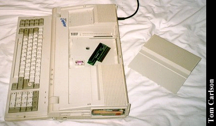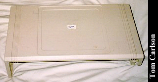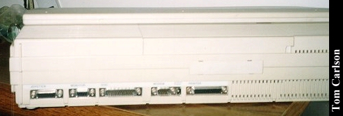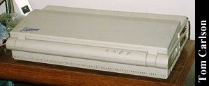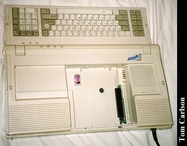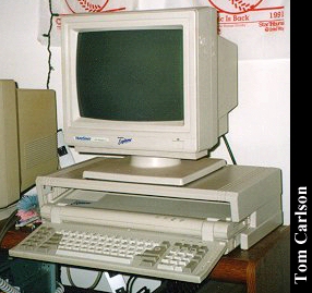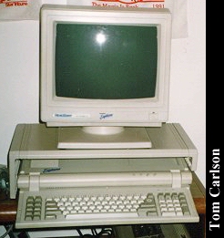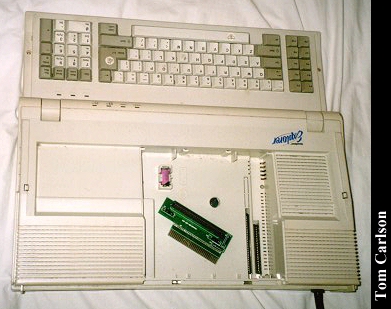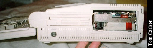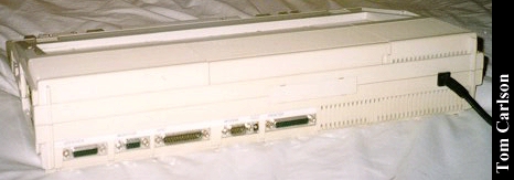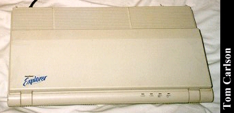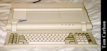 Donors: Stefan Jones & Chris Chan The HeadStart Explorer was an XT clone with some special features. First, it came in the nice package you see above. The included monitor had a nice stand that straddled the main unit. The main unit could slide in and out of the monitor stand. Even when slid fully under the monitor stand, cut-outs on the sides of the stand let you insert disks and power the system on and off. The keyboard was attached to the main unit and could be folded up to make a compact package. The system had built-in CGA graphics, a 3½" floppy drive, and a small hard drive. HeadStart included a nice graphical shell to let you easily run programs. (My wife had one of these years back. The first thing she did was turn off the shell. How can you not love a woman who prefers a command line?) The system unit did have room for one 8-bit card. The card would actually sit horizontally, just under the cover on the main unit. The slot on the motherboard was vertical, as usual. So there was an included 90° adapter that would plug into the motherboard, thus providing a horizontally oriented slot for the card. Overall, it's a really nice system, except: There was a small problem with the hard drive. The bay in which it sits does not have adequate ventilation. If you left the drive running for a long while, it would really heat up. Eventually, it could heat up to the point of softening the plastic around it. If you weren't using the monitor stand, and had just set the monitor on the main unit, that side could start to smush down. Another, less serious, problem with the drive was that it was LOUD. Not so much when it was just spinning, but you could really hear each and every disk access. It wasn't a bad sound, like a grinding. It was just alot louder than most drives.