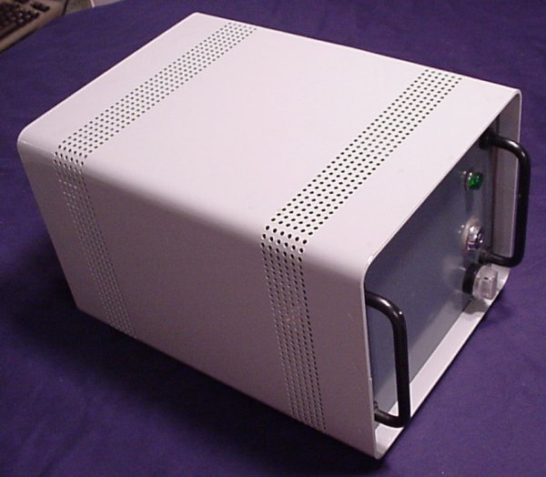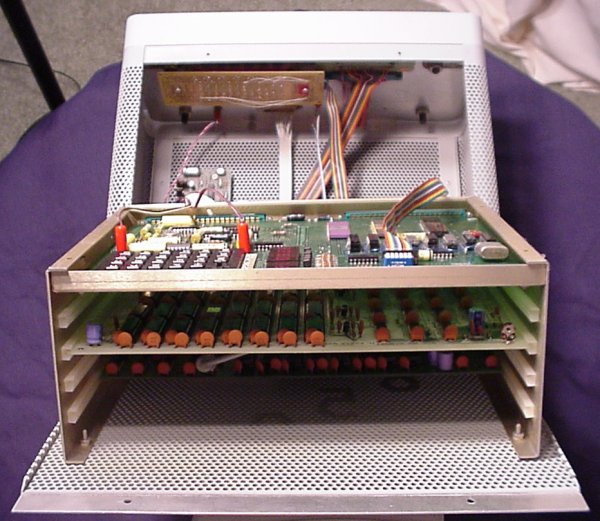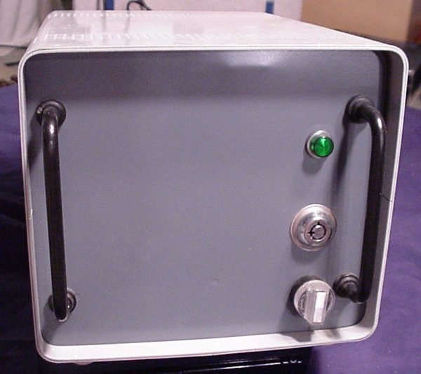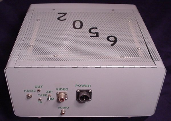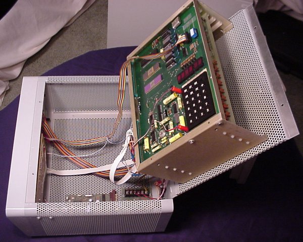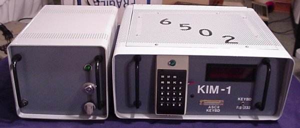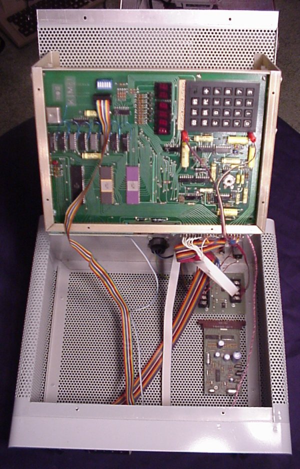 Donor: (Still looking it up...) This is the very first computer that Commodore ever made. It's the single board KIM-1. It has an on-board keypad and 6 digit LED read-out. Of course, real techies didn't leave their single board computers just sitting out in the open. Oh no. They built really cool cases for them. This particular case featured a flip-top, a card cage for the RAM board, an extension of the keypad and display to the front of the enclosure, a bunch of connections on the back and a terminal hook-up. (And, of course, the required switch to choose between keypad and terminal.) There's also a very manly external power supply.