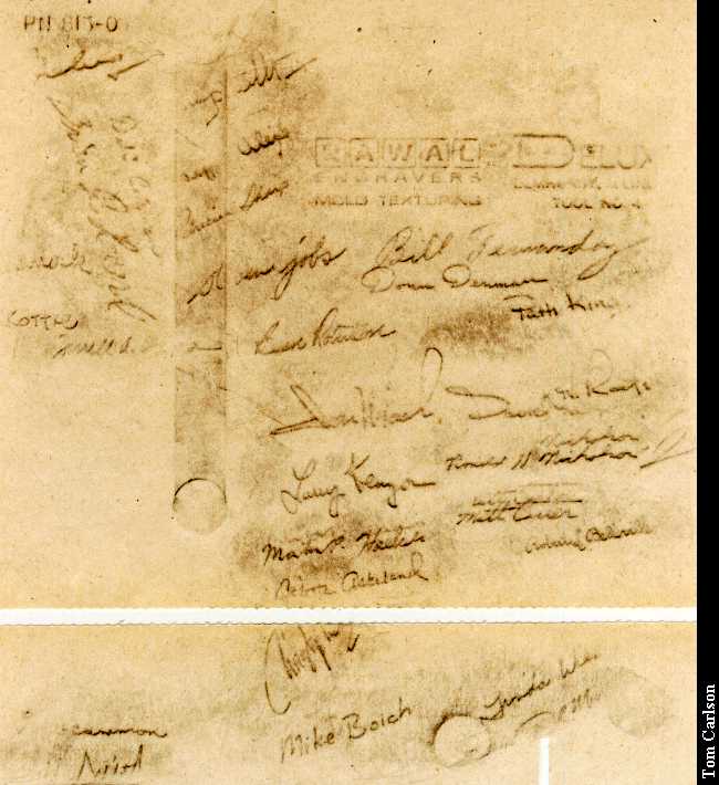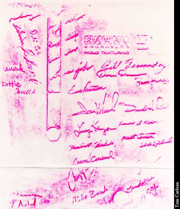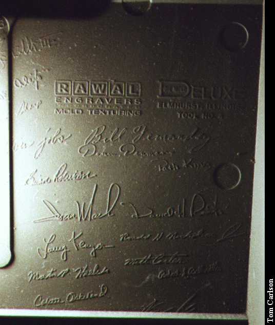 Interestingly, the stock SE has a signed case. Molded into the inside of the back of the case are the signatures of the people who worked on the Macs, including Steve Jobs. I had thought that the only Macs with signed cases were the 128k and 512k models. Shows what I know. I didn't think the signatures would show up very well in a photograph, so I made two rubbings of them and scanned those in: After a week, I was feeling much better and decided to reassemble a complete and working SE. Try as I might, I couldn't find a way to smoothly slide in the logic board with the accelerator attached. Nor could I find a way to slide them in seperately. I didn't want to get into dissassembling the entire frame, so I just pried it in with a screwdriver. (After all, I did have a spare logic board in case I cracked this one.) With a bit of work, the monitor card fit, barely. I put the case back together, plugged it in, and turned it on. And it actually worked! So now I have a 4 meg, 68020-based Mac SE with a full-page monitor. Now I'm trying to find an ethernet adapter for it.