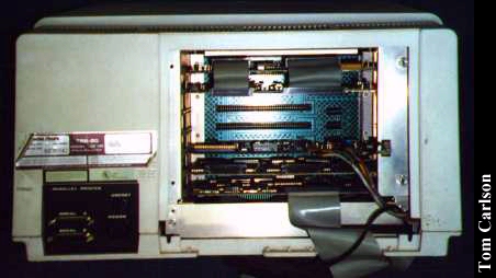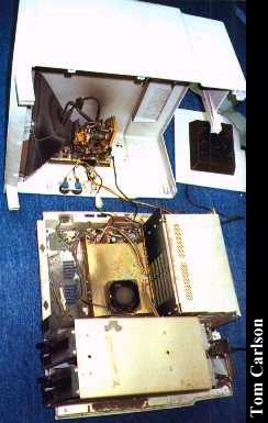 Last Owner: K. Slettemoen & T. Carlson Location: Last seen in the NCSC Trash Vault The Tandy 16b, and the similar Tandy 6000, were Tandy's stab at a multi-user business system. These machines came equiped with both a Motorola 68000 and a Zilog Z-80. 64Kb of RAM was standard, but could be expanded up to a whole megabyte. You had a wide range of operating systems from which to choose. Using the Z-80 chip, these systems could run good old CP/M. Being Tandy's, they could also run LDOS. Utilizing the 68000 chip, they could also run Xenix, Microsoft's early UNIX experiment, that later morphed into SCO UNIX. Under Xenix, the 16b/6000 could handle two stand-alone terminals in addition to the base unit itself. The 16b came standard with two 8" 1.2 meg floppy drives. The 6000 could also be equipped with one floppy and an internal 15 meg hard drive. A green monochrome screen was also standard. The usual terminal was the DT-1, a dumb terminal housed in a TRS-80 Model 3 shell. Unfortunately, none of these actual pieces of hardware that I have sitting here actually work. I cleaned them up, cleaned and rechecked connections, and so on, but was unable to get them to boot up at all. So I tossed them, but not before taking some pictures.
