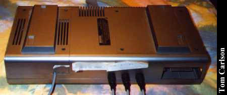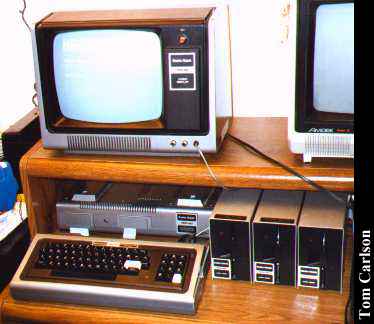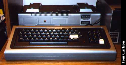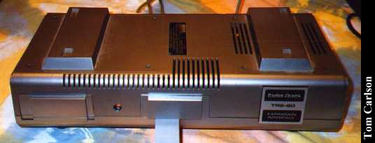 Donor: Alan Draves Tandy/Radio Shack's first PC. The Model 1 came with 4Kb RAM standard. The built in Basic, called Basic Level 1, was extremely limited. It had only 26 possible variables, labelled A-Z of course, and one and only one integer array variable, called A(). The monitor was basically an RCA TV with the tuner removed. Storage was on cassette tape. Most Model 1s were upgraded to 16Kb and Level 2 Basic. Additional expandibility was gained through the Expansion Interface. This fair sized box connected to the back of the Model 1 via a short ribbon cable. The monitor then sat on top of the Expansion Interface. With an Expansion Interface, you could add additional memory, control serial devices, use two tape decks instead of just one, and control up to four floppy drives. This particular Model 1 has 16KB RAM, an Expansion Interface, and three floppy drives. One floppy isn't quite working and the monitor crackles like a bowl of Rice Krispies, but the system works great otherwise. There were a number of DOSs available for the TRS-80 family. Tandy/Radio Shack's TRSDOS was generally regarded as being pretty crummy. Third-party DOSs were much more usable. This particular Model 1 came to me with both TRSDOS 2 and NewDos/80, one of the more popular third-party DOSs. This particular Model 1 also came with a Pascal compiler, a COBOL compiler, and loads of games. The games are very good and very playable, especially considering the limited graphics available.