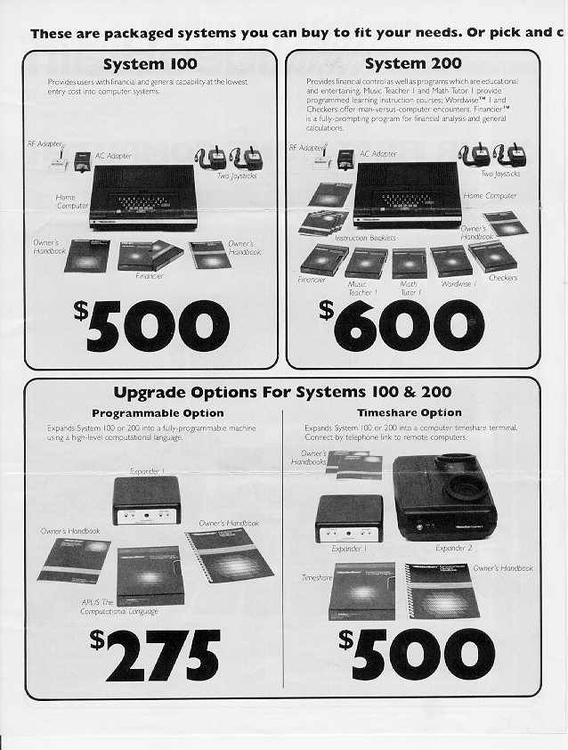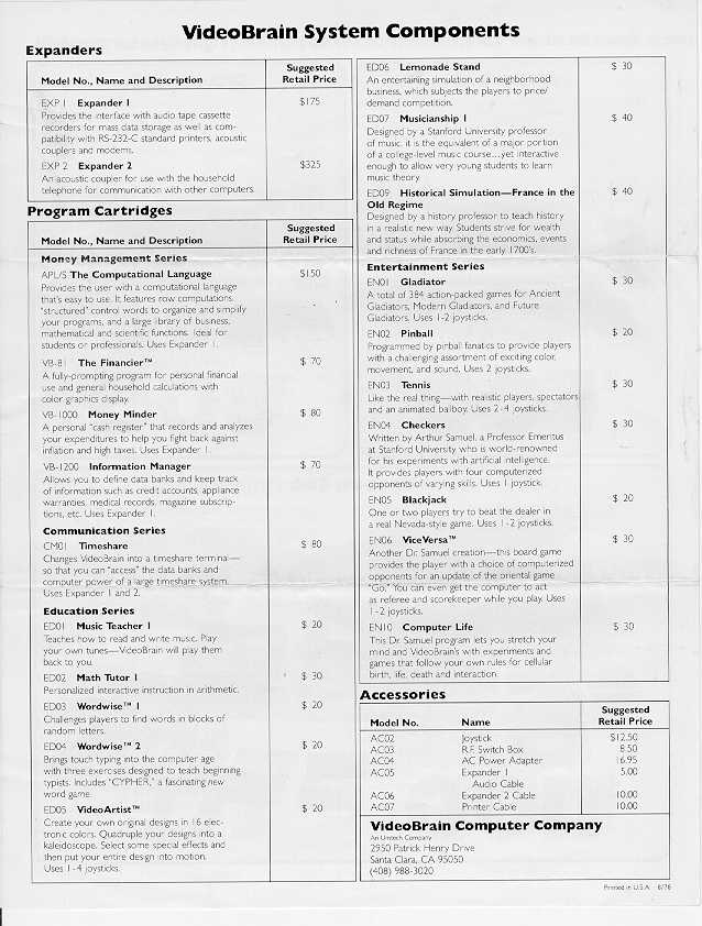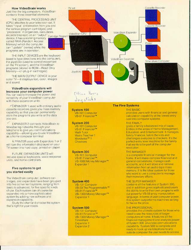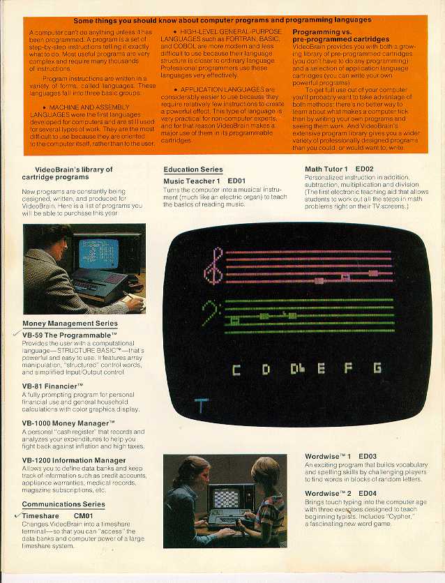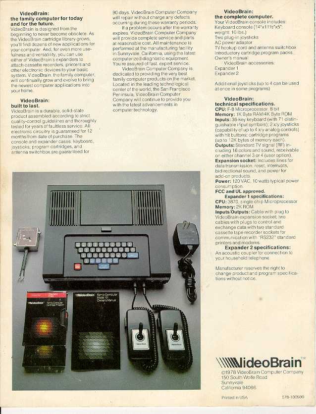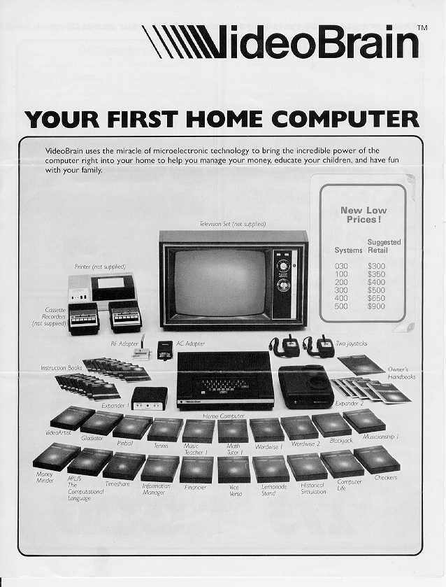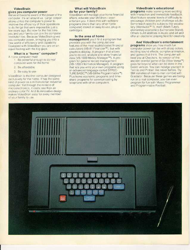 Owner: Jeff Wright The VideoBrain was one of the earliest color graphics computers. Jeff kindly supplied me with detailed brochures about it. The following two brochures are scanned in at a pretty high resolution, high enough for you to be able to read the text. But be forewarned, each page is around 400k.